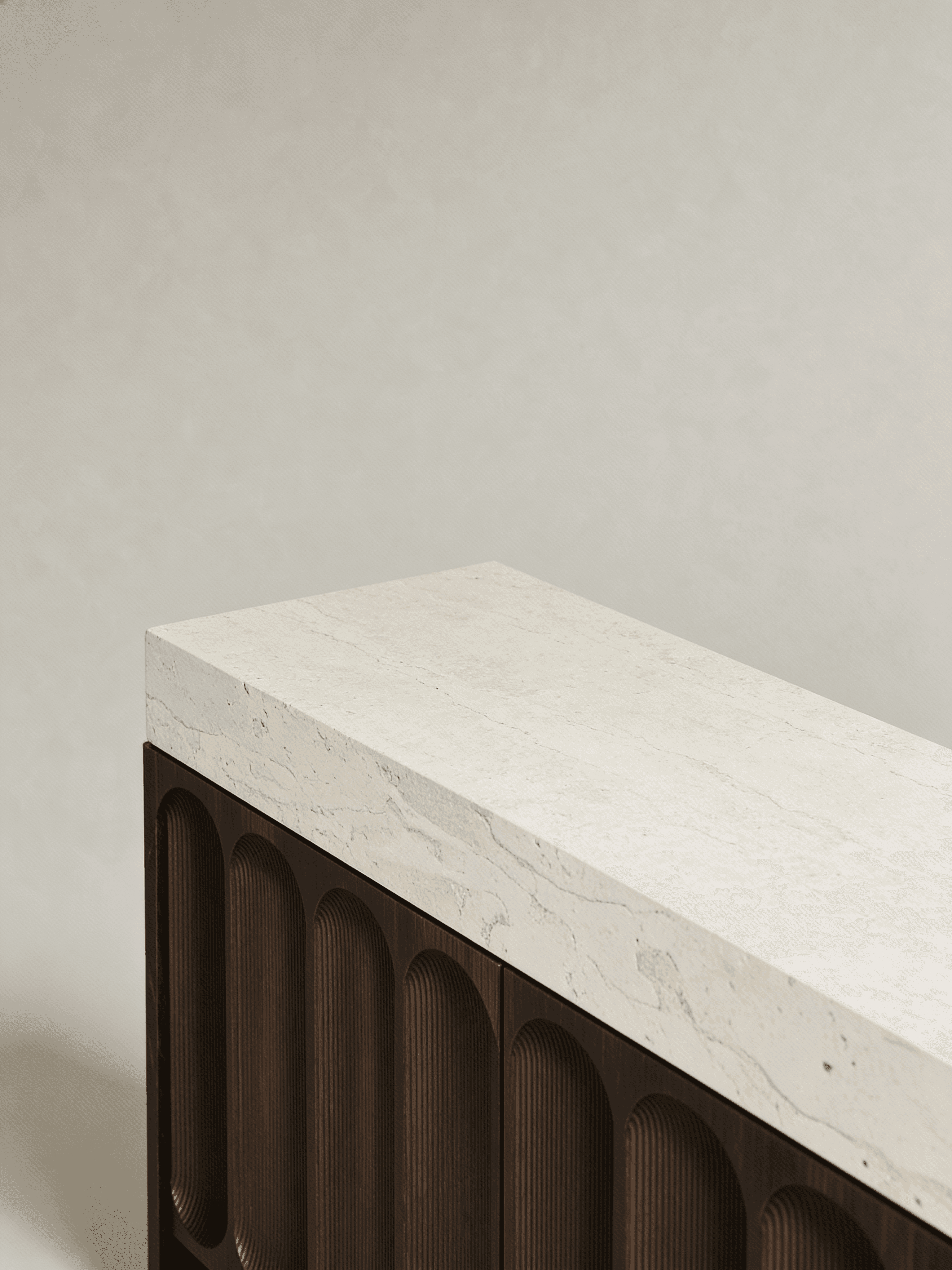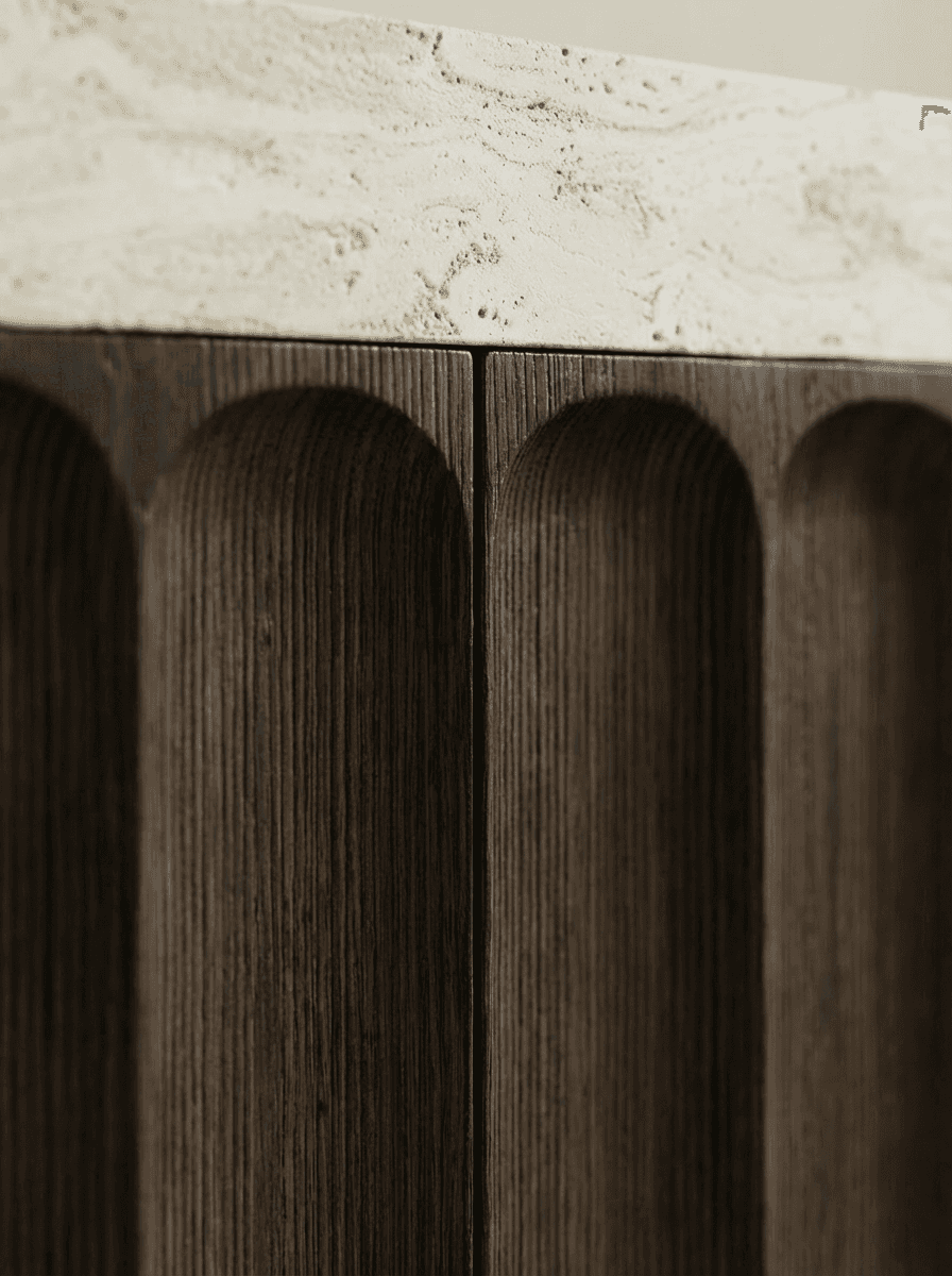 The IKE Collection is a study in tactility and form, rooted in echoes of ancient craft. Each piece draws on carving traditions of early civilizations, where objects were shaped to carry both function and ritual weight. Surfaces are hand-tooled, gouged, or fluted, allowing light to move across the grain of the wood with a shifting rhythm. Natural materials define the palette: richly grained timbers, honed marbles, and upholstery in linen, suede, or leather. The construction is direct and architectural, yet softened by sculptural gestures, rounded legs, carved volumes, and textures that speak to the hand as much as the eye. At once grounded and expressive, the collection balances strength with refinement. Furniture becomes more than utility; it becomes artefact, timeless, enduring, and alive with the memory of touch.
