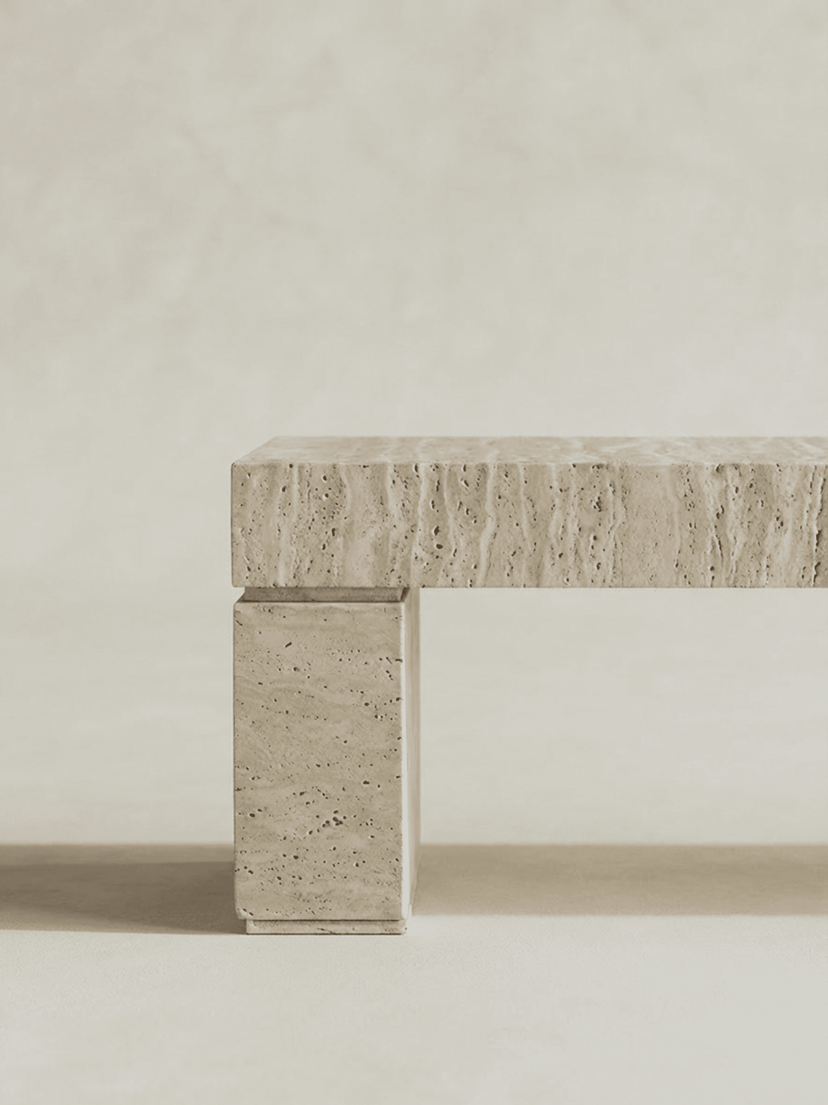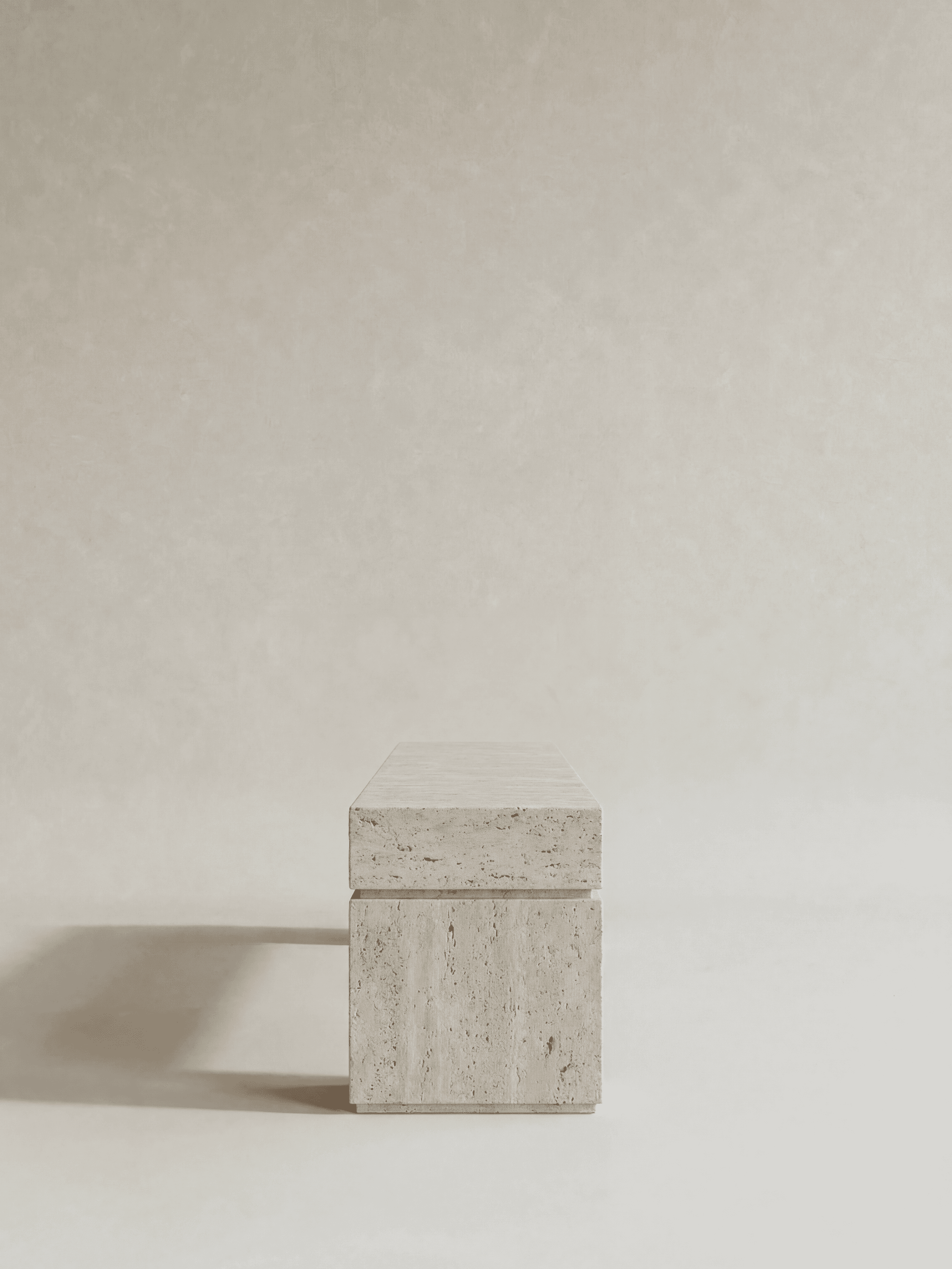 LUCA is defined by contrast and clarity. The collection brings together travertine and bleached white oak, pairing the permanence of stone with the warmth of timber. Its forms draw from the lineage of Italian modular seating, referencing the expansive, adaptable sofas championed by designers such as Bellini. The sofas are composed with intention: curved bolsters and soft upholstery set against sharp-edged plinths that ground each piece with architectural precision. This interplay between softness and structure gives LUCA its character, sculptural yet comfortable, refined yet inviting. Travertine anchors the collection, lending weight and durability while allowing the pieces to move fluidly between indoor and outdoor settings. Whether placed in a living room, terrace, or courtyard, LUCA is designed to hold space with confidence. Contemporary in expression and enduring in construction, LUCA is furniture shaped by Italian modernism and material integrity, created for versatile, considered living.