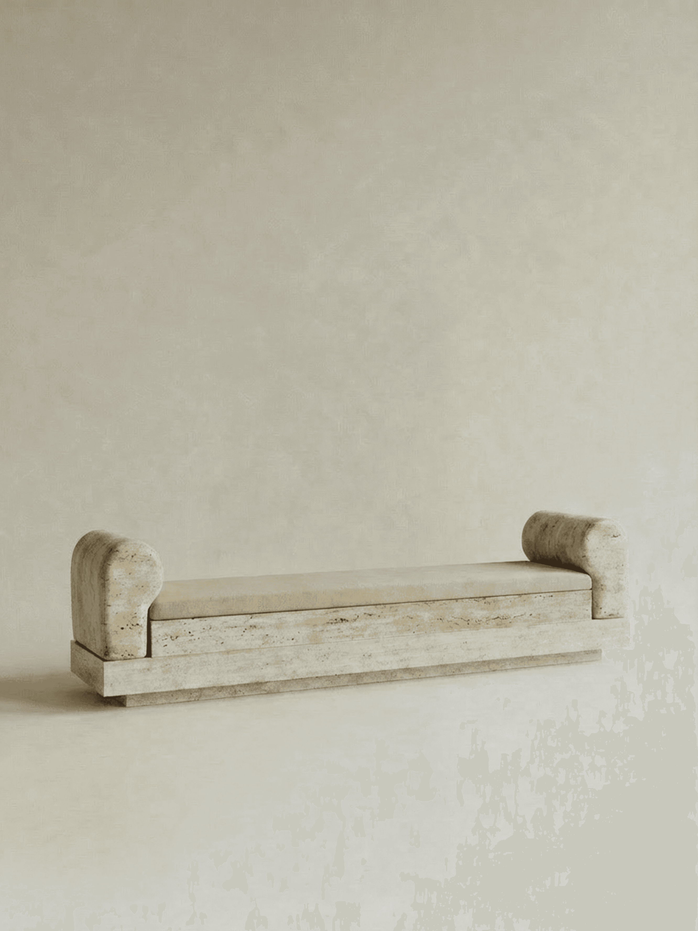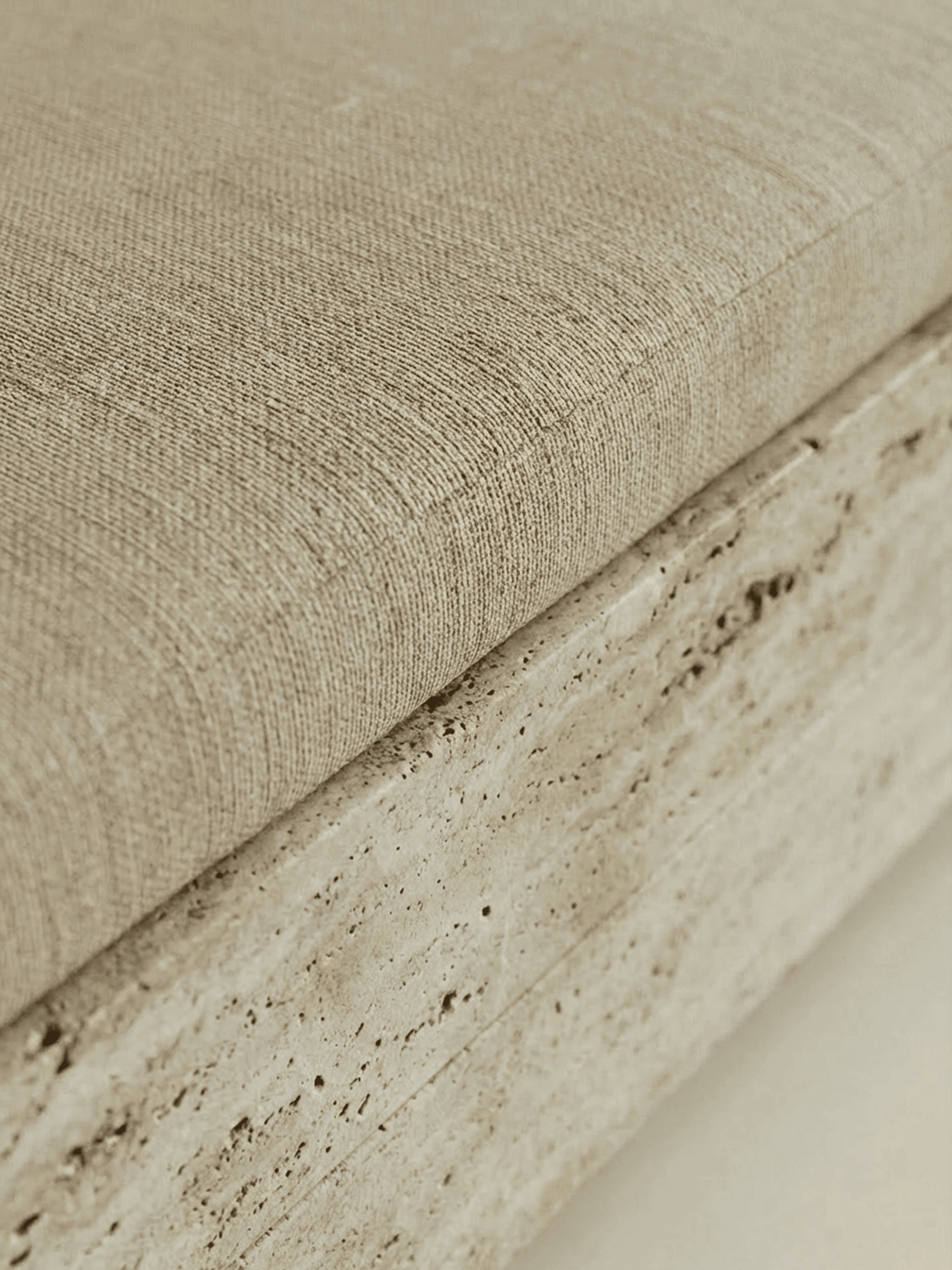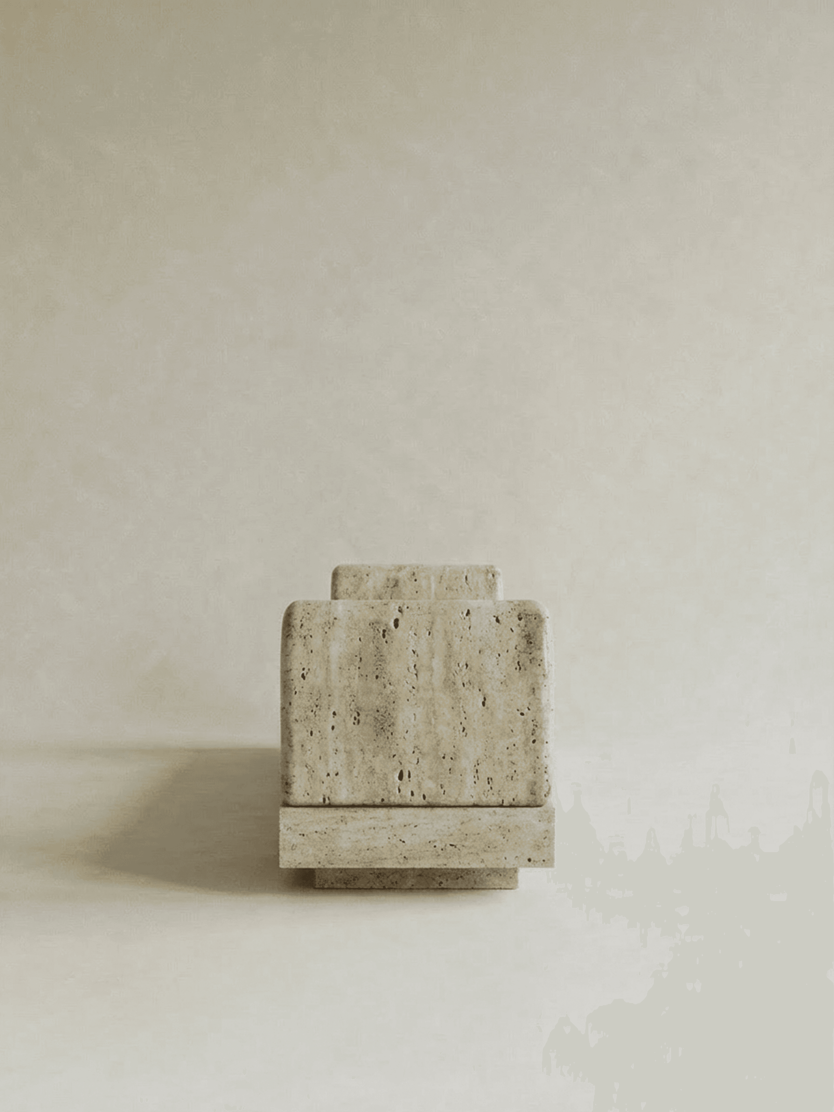 LUCA is defined by contrast and clarity. The collection brings together travertine and bleached white oak, pairing the permanence of stone with the warmth of timber. Its forms draw from the lineage of Italian modular seating, referencing the expansive, adaptable sofas championed by designers such as Bellini. The sofas are composed with intention: curved bolsters and soft upholstery set against sharp-edged plinths that ground each piece with architectural precision. This interplay between softness and structure gives LUCA its character, sculptural yet comfortable, refined yet inviting. Travertine anchors the collection, lending weight and durability while allowing the pieces to move fluidly between indoor and outdoor settings. Whether placed in a living room, terrace, or courtyard, LUCA is designed to hold space with confidence. Contemporary in expression and enduring in construction, LUCA is furniture shaped by Italian modernism and material integrity, created for versatile, considered living.