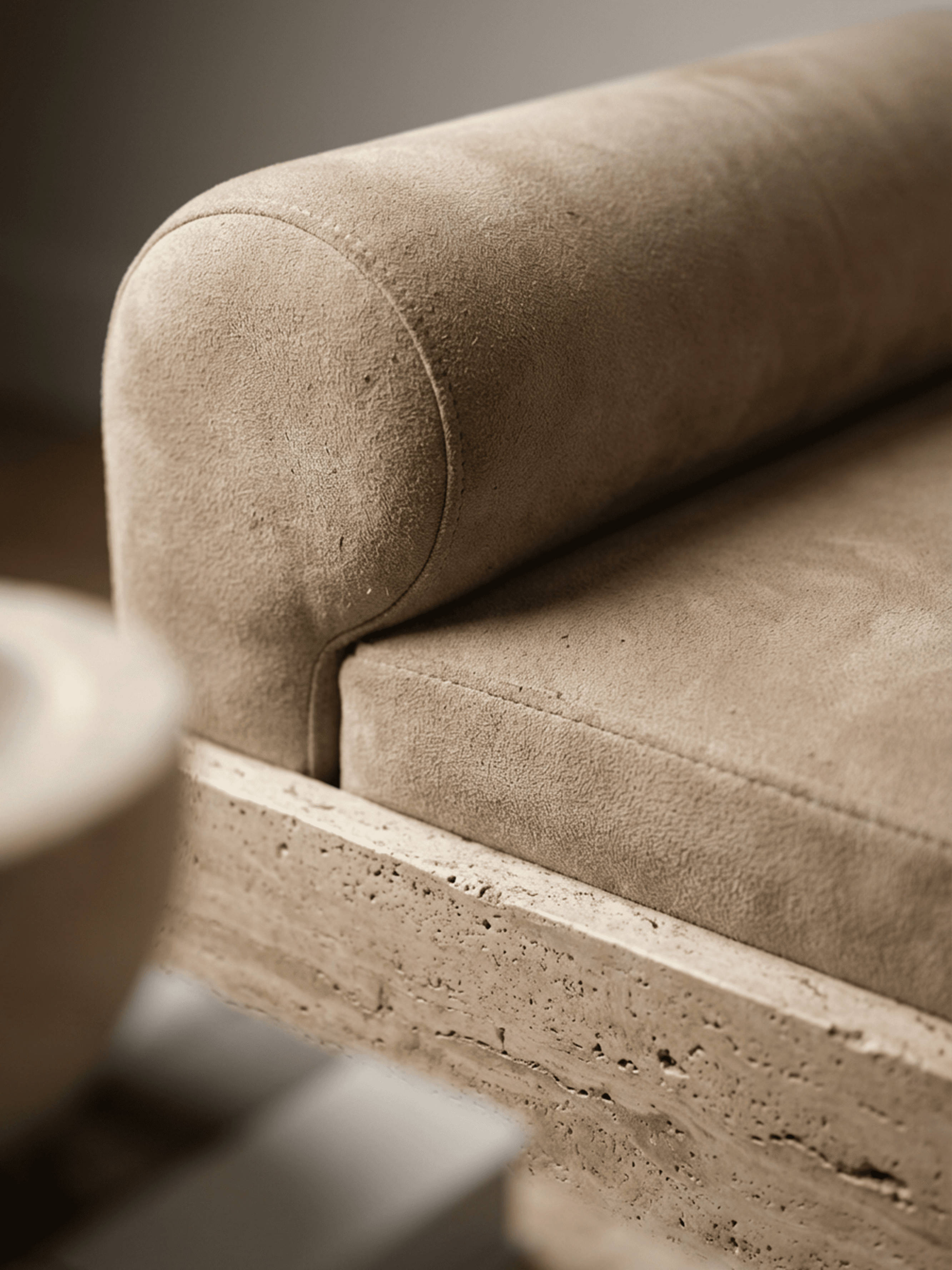 LUCA is defined by contrast and clarity. The collection brings together travertine and bleached white oak, pairing the permanence of stone with the warmth of timber. Its forms draw from the lineage of Italian modular seating, referencing the expansive, adaptable sofas championed by designers such as Bellini. The sofas are composed with intention: curved bolsters and soft upholstery set against sharp-edged plinths that ground each piece with architectural precision. This interplay between softness and structure gives LUCA its character, sculptural yet comfortable, refined yet inviting. Travertine anchors the collection, lending weight and durability while allowing the pieces to move fluidly between indoor and outdoor settings. Whether placed in a living room, terrace, or courtyard, LUCA is designed to hold space with confidence. Contemporary in expression and enduring in construction, LUCA is furniture shaped by Italian modernism and material integrity, created for versatile, considered living.