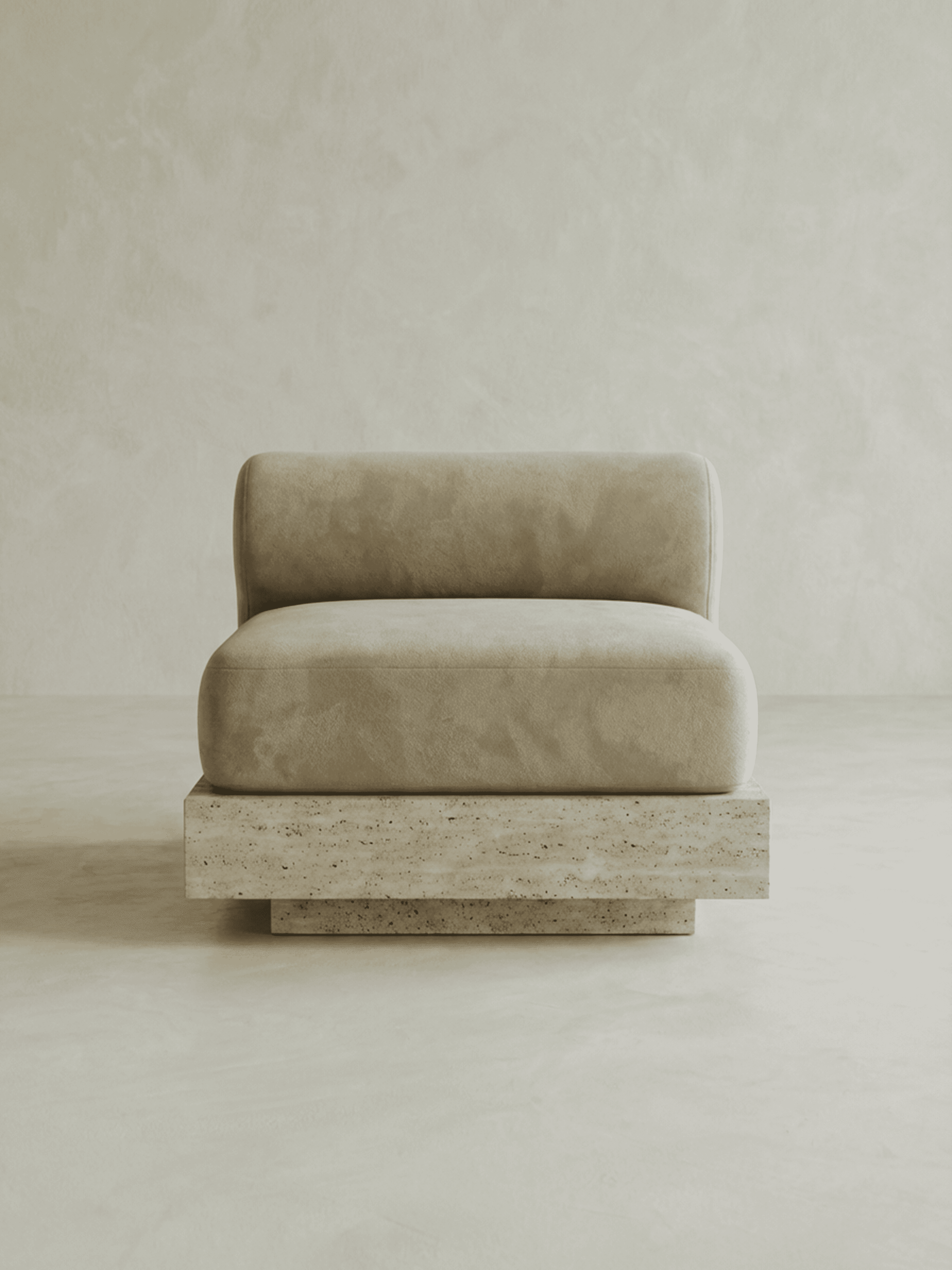 LUCA is defined by contrast and clarity. The collection brings together travertine and bleached white oak, pairing the permanence of stone with the warmth of timber. Its forms draw from the lineage of Italian modular seating, referencing the expansive, adaptable sofas championed by designers such as Bellini. The sofas are composed with intention: curved bolsters and soft upholstery set against sharp-edged plinths that ground each piece with architectural precision. This interplay between softness and structure gives LUCA its character, sculptural yet comfortable, refined yet inviting. Travertine anchors the collection, lending weight and durability while allowing the pieces to move fluidly between indoor and outdoor settings. Whether placed in a living room, terrace, or courtyard, LUCA is designed to hold space with confidence. Contemporary in expression and enduring in construction, LUCA is furniture shaped by Italian modernism and material integrity, created for versatile, considered living.