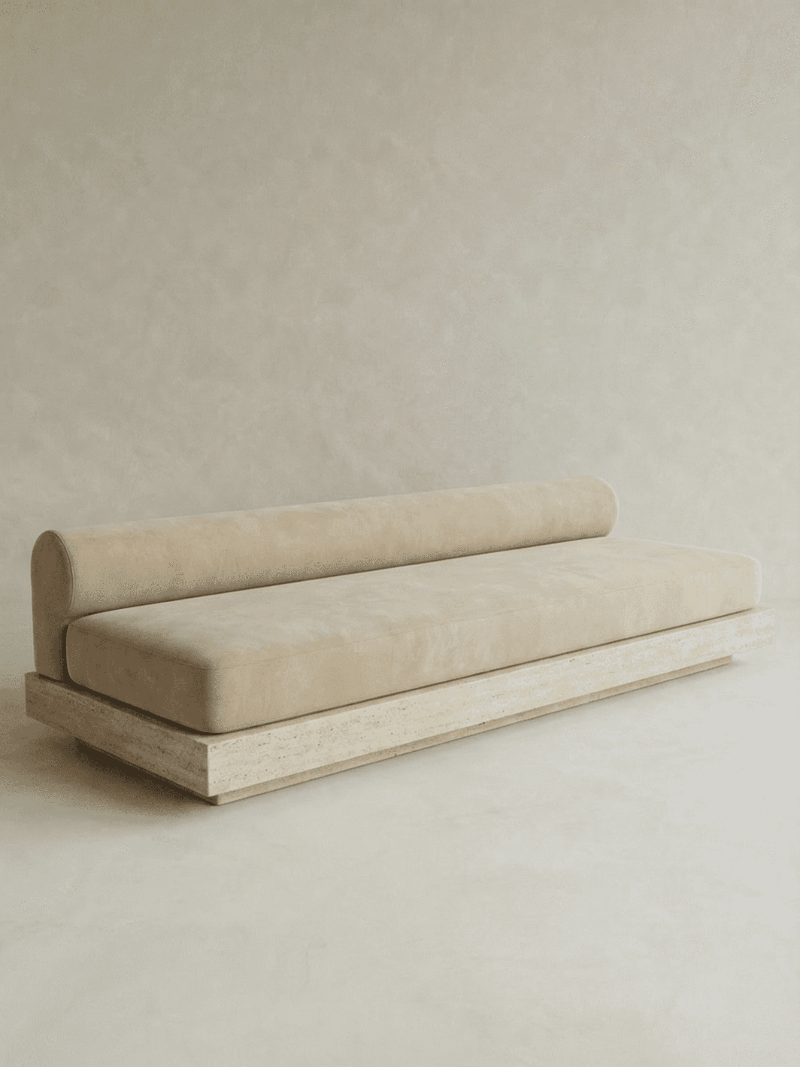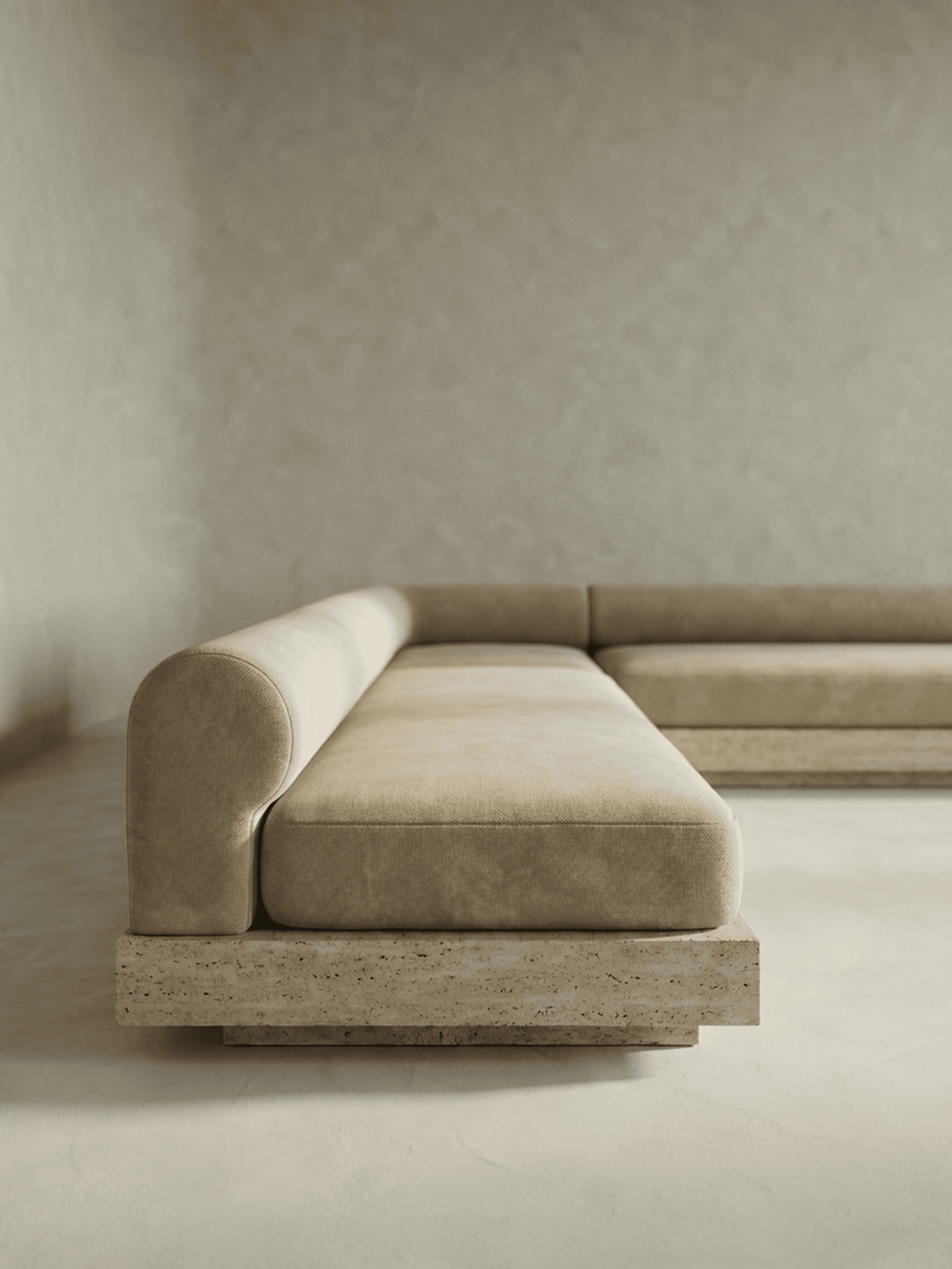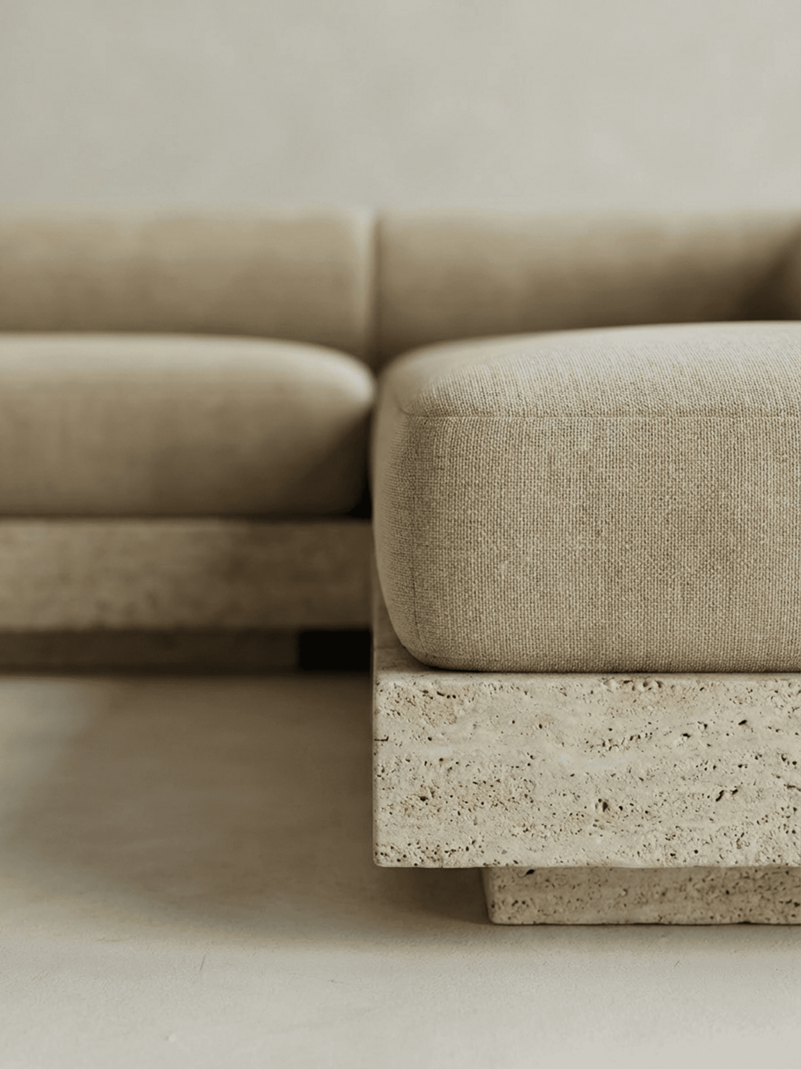 LUCA is defined by contrast and clarity. The collection brings together travertine and bleached white oak, pairing the permanence of stone with the warmth of timber. Its forms draw from the lineage of Italian modular seating, referencing the expansive, adaptable sofas championed by designers such as Bellini. The sofas are composed with intention: curved bolsters and soft upholstery set against sharp-edged plinths that ground each piece with architectural precision. This interplay between softness and structure gives LUCA its character, sculptural yet comfortable, refined yet inviting. Travertine anchors the collection, lending weight and durability while allowing the pieces to move fluidly between indoor and outdoor settings. Whether placed in a living room, terrace, or courtyard, LUCA is designed to hold space with confidence. Contemporary in expression and enduring in construction, LUCA is furniture shaped by Italian modernism and material integrity, created for versatile, considered living.