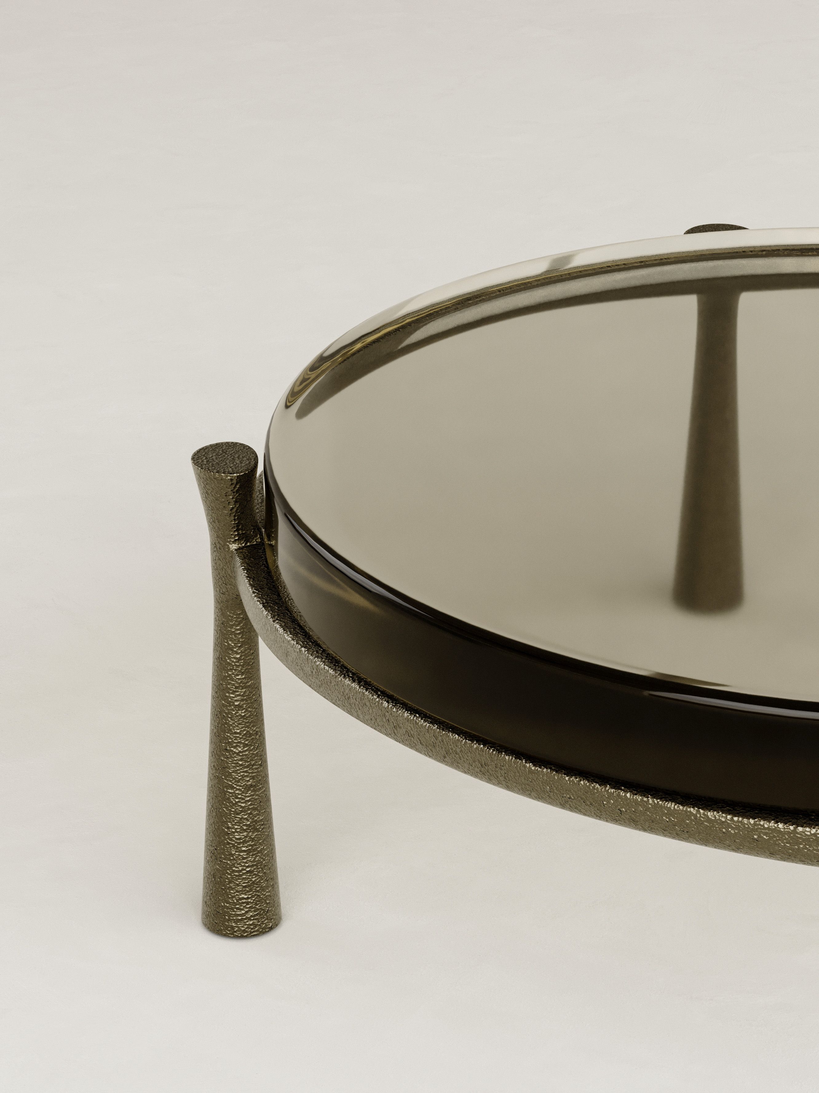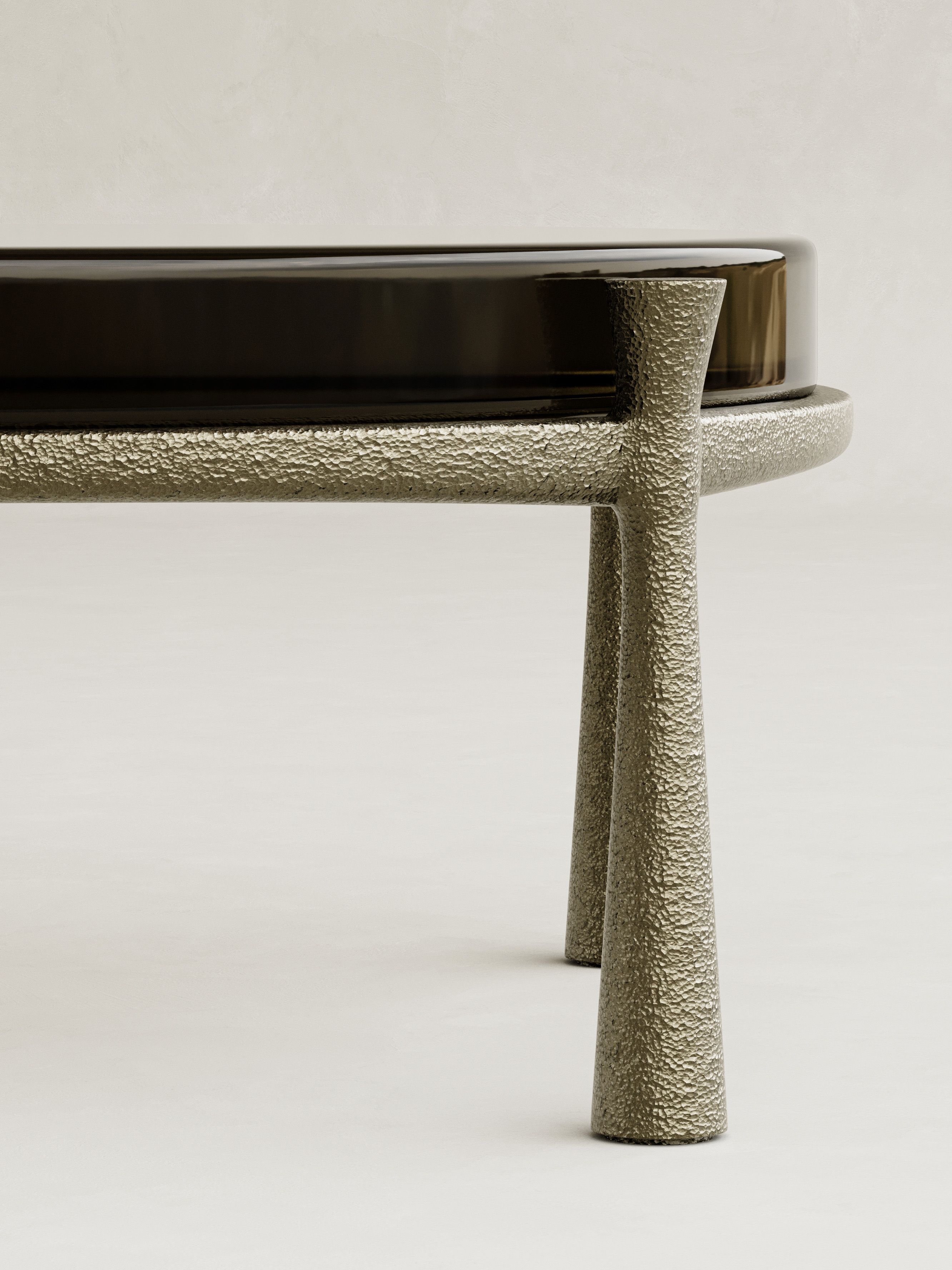 ORIN is defined by a quiet strength and a sense of poised balance, expressed through sculptural forms cast brass and softened by glass and mohair. The collection is anchored by a distinctive structural gesture: slender, textured legs that rise with subtle curvature, creating a rhythmic framework that supports each piece with elegance and restraint. Cast brass brings depth and tactility, its surface catching light with a muted glow, while translucent glass and plush mohair introduce contrast and warmth. This recurring interplay of structure and softness becomes the signature of ORIN, uniting the collection through a language that is both architectural and intimate. Contemporary yet enduring, ORIN explores material refinement and sculptural clarity, resulting in furniture conceived as lasting objects of presence and quiet sophistication.