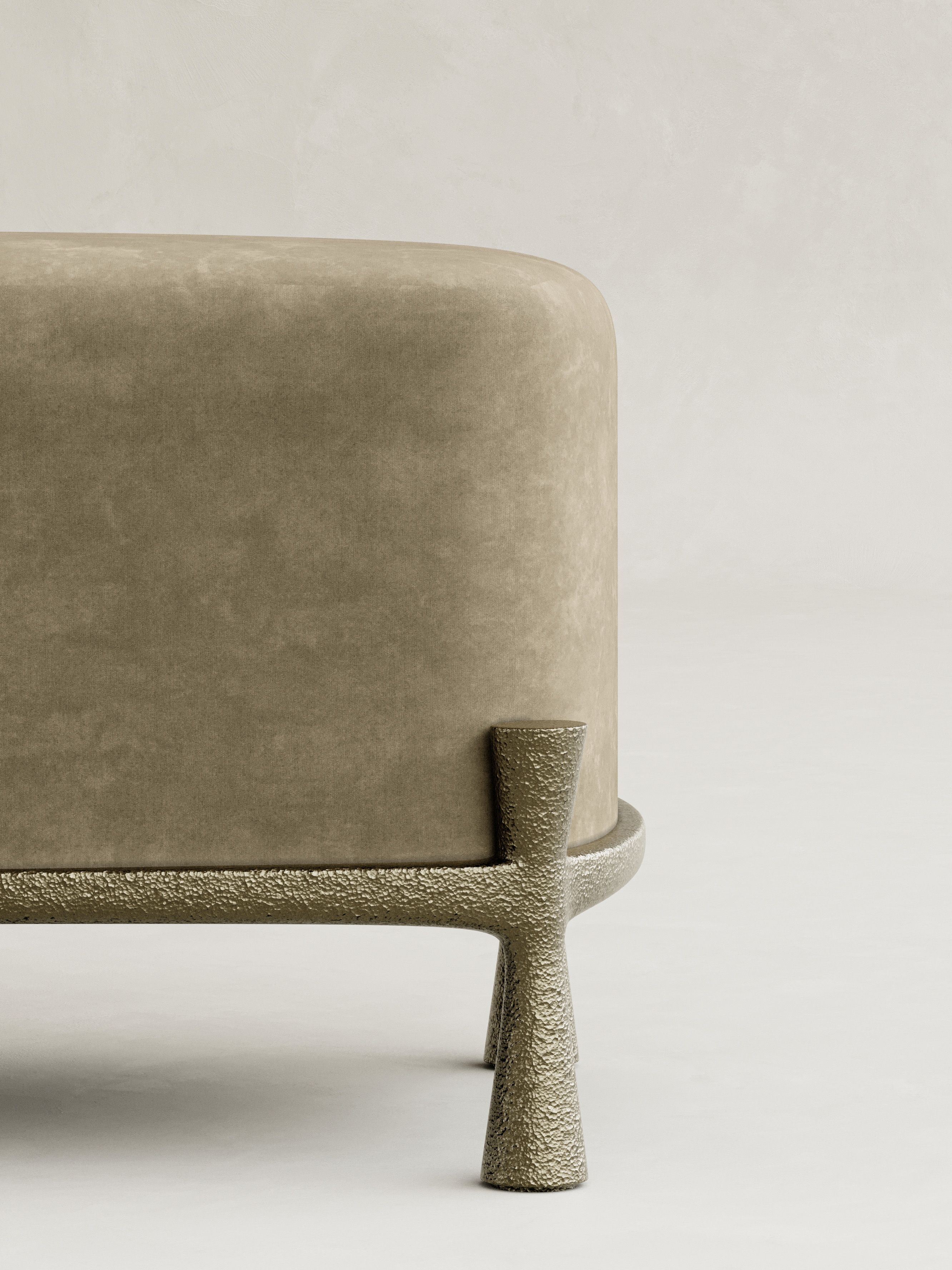 ORIN is defined by a quiet strength and a sense of poised balance, expressed through sculptural forms cast brass and softened by glass and mohair. The collection is anchored by a distinctive structural gesture: slender, textured legs that rise with subtle curvature, creating a rhythmic framework that supports each piece with elegance and restraint. Cast brass brings depth and tactility, its surface catching light with a muted glow, while translucent glass and plush mohair introduce contrast and warmth. This recurring interplay of structure and softness becomes the signature of ORIN, uniting the collection through a language that is both architectural and intimate. Contemporary yet enduring, ORIN explores material refinement and sculptural clarity, resulting in furniture conceived as lasting objects of presence and quiet sophistication.